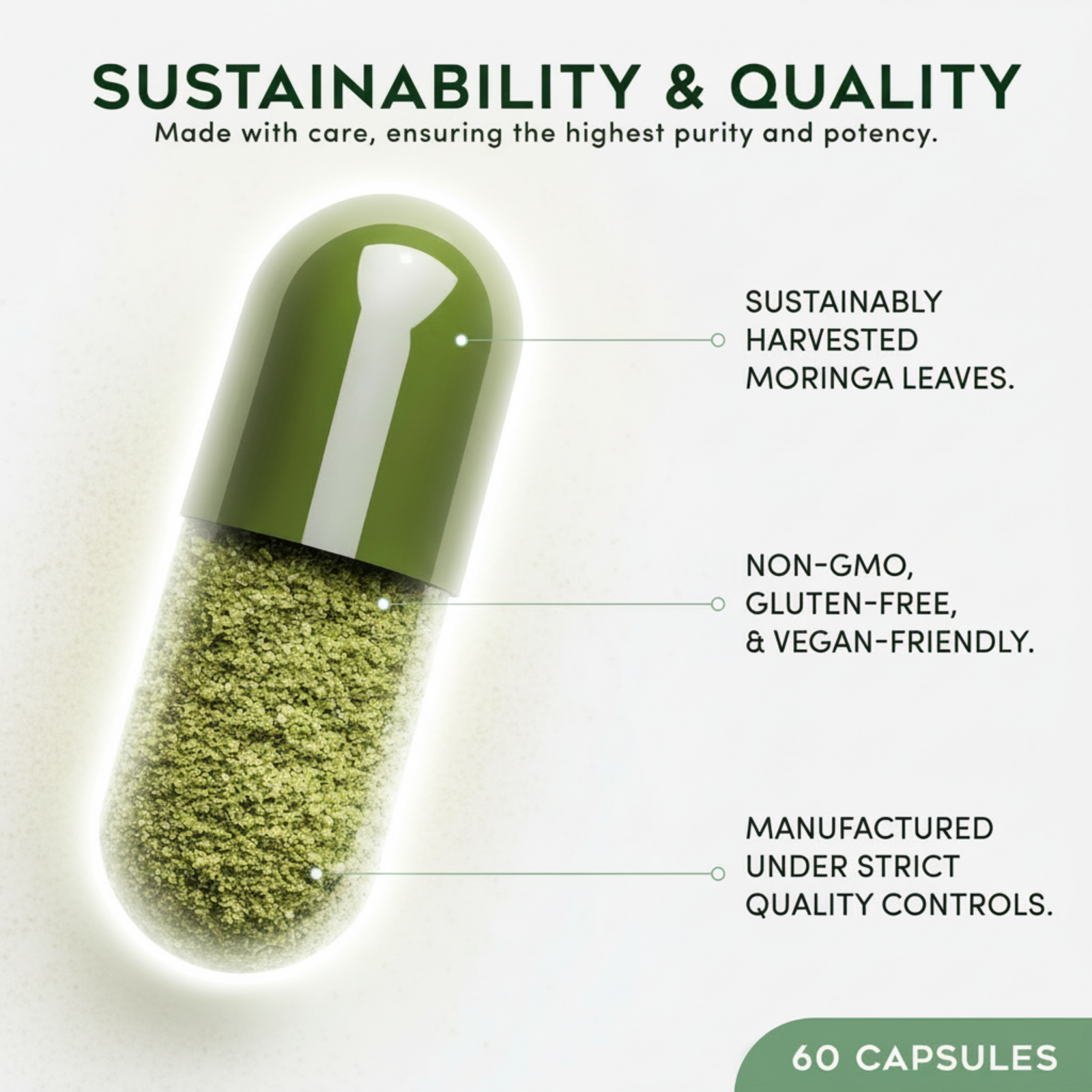 Pure Moringa is produced in an FDA‑registered facility under strict quality control. It’s 100% non‑GMO, gluten‑free, and additive‑free — just clean, reliable moringa in every capsule.